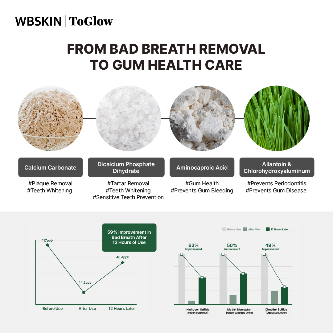 Aqua Mint: [Active Ingredients] Precipitated Calcium Carbonate, Dicalcium Phosphate Hydrate, Aminocaproic Acid, Allantoin Chlorohydroxy Aluminum [Other Additives] Glycerin, Sorbitol Solution, Polyethylene Glycol 1500, Xylitol, Steviol Glycosides, Saccharin Sodium, Sodium Benzoate, Green No. 202, Cellulose Gum, Silica, Ascorbic Acid, Citric Acid, Chitosan, Sodium Lauryl Sulfate, Matricaria (Chamomile) Extract, Green Tea Extract, Grapefruit Seed Extract, Compound Fragrance (Aqua Mint Scent), L-Menthol, Eucalyptus, Purified Water.