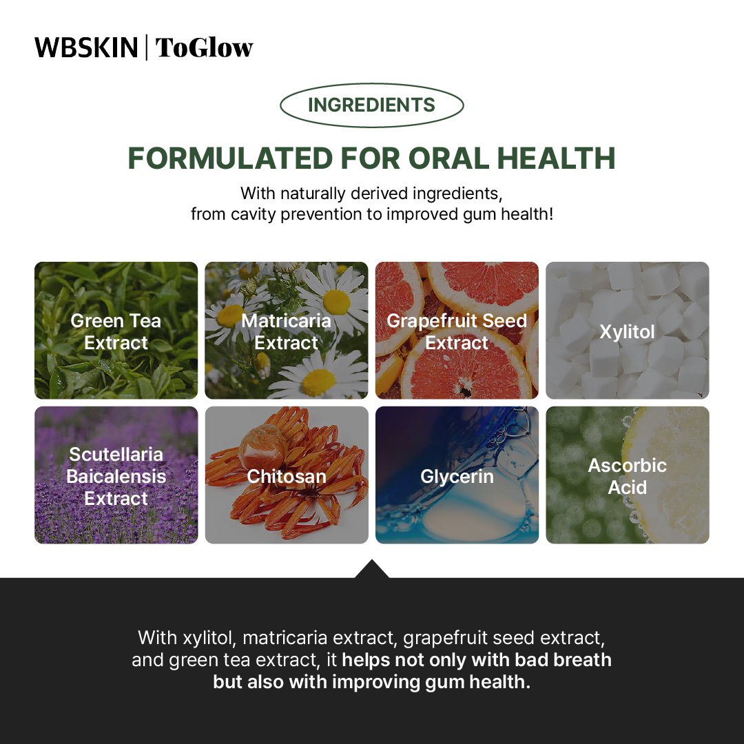 Mint: [Active Ingredients] Precipitated Calcium Carbonate, Dicalcium Phosphate Hydrate, Aminocaproic Acid, Allantoin Chlorohydroxy Aluminum [Other Additives] Glycerin, Sorbitol Solution, Polyethylene Glycol 1500, Xylitol, Steviol Glycosides, Saccharin Sodium, Sodium Benzoate, Red No. 40, Cellulose Gum, Silica, Ascorbic Acid, Citric Acid, Chitosan, Sodium Lauryl Sulfate, Matricaria (Chamomile) Extract, Green Tea Extract, Grapefruit Seed Extract, Peppermint Oil, L-Menthol, Eucalyptus, Purified Water.