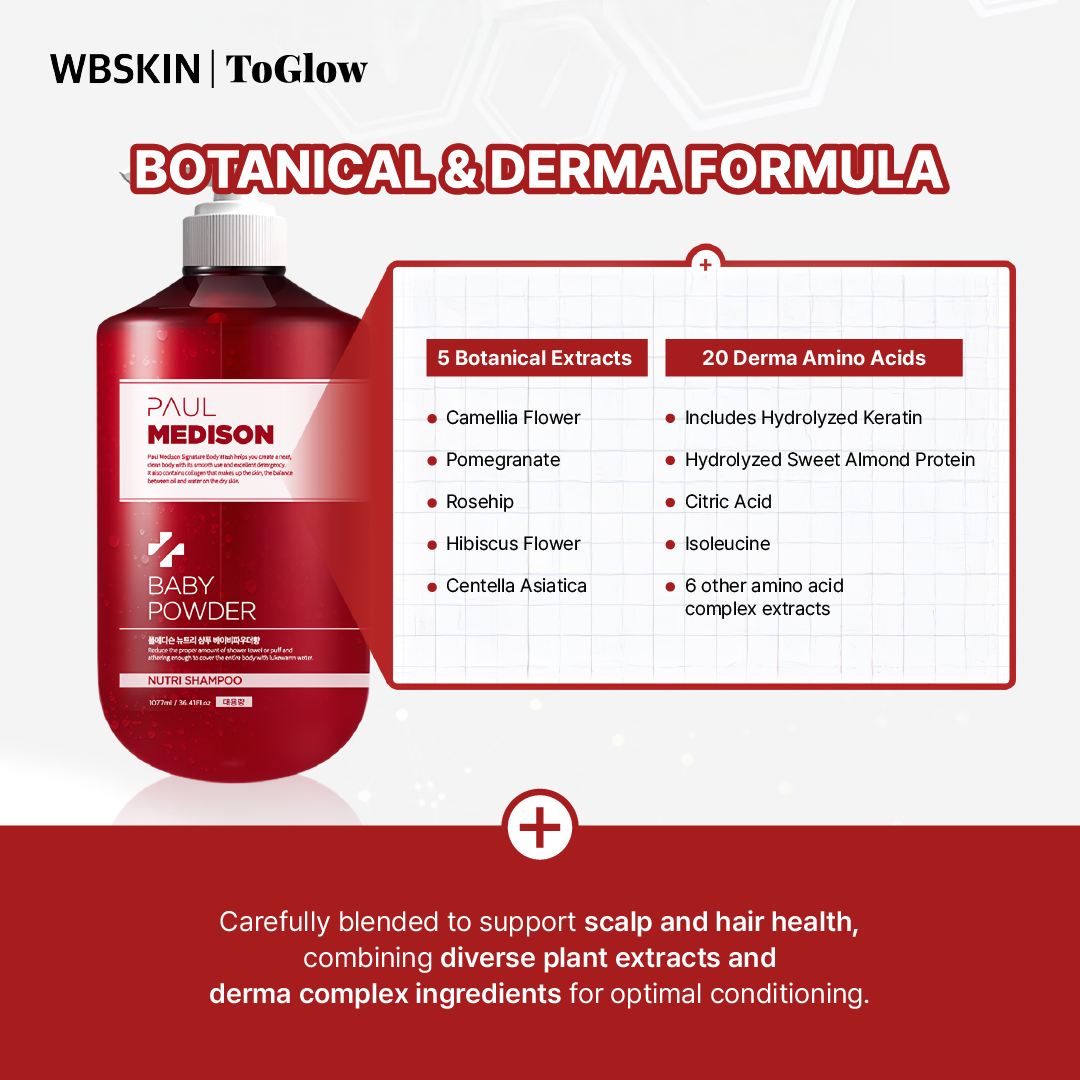 Baby Powder: Purified Water, Sodium Laureth Sulfate, Cocamidopropyl Betaine, Ammonium Lauryl Sulfate, Sodium Chloride, Cocamide MEA, Allantoin, Phenoxyethanol, Polyquaternium-10, Cetearyl Alcohol, Hydrolyzed Keratin, Hydrolyzed Sweet Almond Protein, Citric Acid, Camellia Flower Extract, Pomegranate Extract, Rosehip Fruit Extract, Hibiscus Flower Extract, Centella Asiatica Extract, Arginine, Leucine, Tryptophan, Lysine, Isoleucine, Threonine, Methionine, Histidine, Asparagine, Alanine, Proline, Glutamic Acid, Glutamine, Glycine, Valine, Phenylalanine, Aspartic Acid, Tyrosine, Serine, Cystine, Benzyl Benzoate, Butylphenyl Methylpropional, Linalool, Citronellol, Alpha-Isomethyl Ionone, Amyl Cinnamal, Geraniol, Coumarin, Benzyl Alcohol, Limonene, Fragrance.